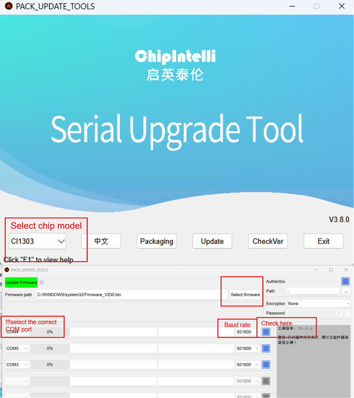 Open the firmware programming tool (found in CI130X_SDK\tools as PACK_UPDATE_TOOL.exe). Select the corresponding chip model, click the firmware update button, select the prepared firmware file, and confirm the COM port assigned to the USB-to-UART tool. After powering the module, it will enter firmware update mode and begin downloading the firmware. If the computer cannot recognize the USB-to-UART tool, please install the appropriate driver first.