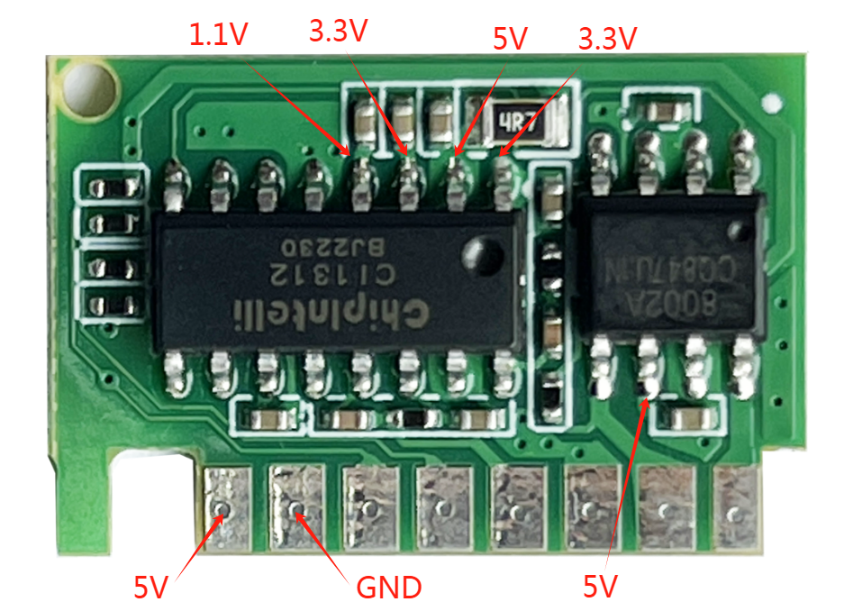 - If the above checks are correct but programming still fails, use a multimeter to measure whether the 5 V, 3.3 V, and 1.1 V rails are correct. Refer to the test points in the figure below. If voltage issues are found, consider a hardware fault; replace the module or repair the hardware. If all checks are normal, contact our technical support team.
