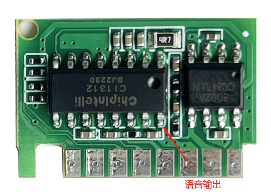- Confirm the speaker is properly connected and power is normal. Use an oscilloscope to measure the voice output test point of the main chip. If there is no output, check whether the firmware is correct. If there is output, check whether the power amplifier on the module has soldering anomalies; replace it if necessary and test again. The measurement point is shown below. If all checks are normal, contact our technical support team.