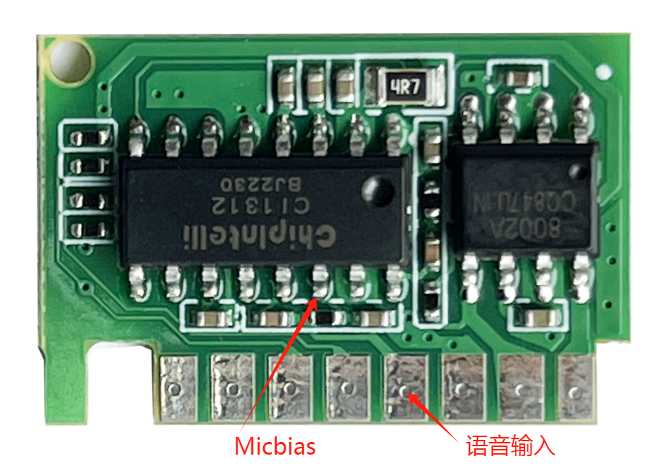 - Use a multimeter to measure whether the MICBIAS pin of the main chip is around 2.8 V, and use an oscilloscope to check whether there is an input voice waveform at the microphone input pin (set 100 mV per division). If the signal is normal, consider firmware issues; if abnormal, inspect the board hardware for physical damage. The measurement point is shown below. If all checks are normal, contact our technical support team.