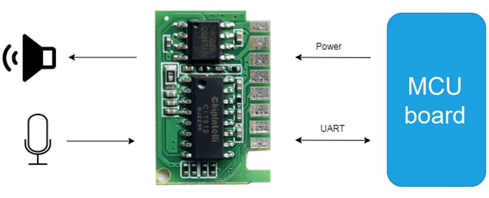This module can be used as a standalone voice recognition module combined with the customer’s main control board, or as a stand-alone main control module for lighting, toys, and other solutions. Connect an external microphone and speaker, and supply power via an external 5 V source.