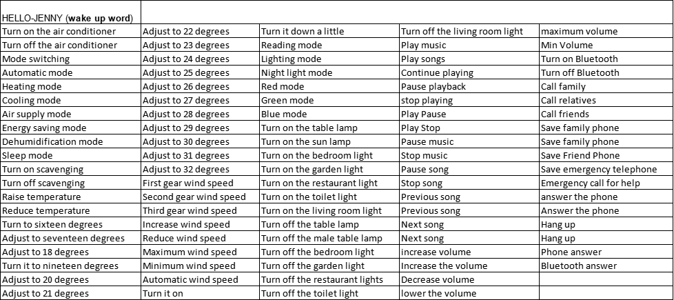 For mass production, user-specified command-word firmware is usually programmed before shipment. If not specified, the module ships with default firmware containing a default command set for testing, as shown below: