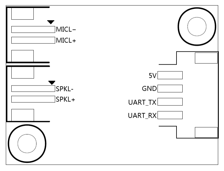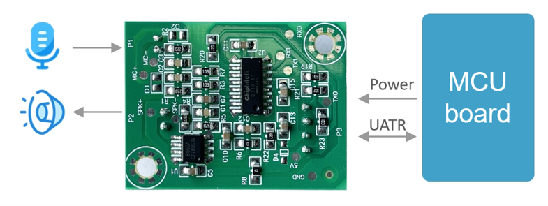 - Integrated microphone input, speaker output, 5V power supply, and UART interface