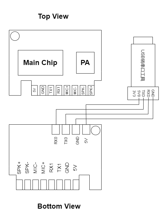 Taking the USB-to-UART converter shown in the above figure as an example, before programming, you need to connect the power, ground, and UART transmit/receive pins of the USB-to-UART converter to the corresponding pins of the module (note that the RXD and TXD of the USB-to-UART converter correspond to the TX0 and RX0 of the module, respectively). The connection method is shown in the figure below.