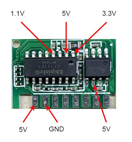 - If the above checks are correct but the module still cannot be programmed, use a multimeter to measure the module’s power supply voltages of 5V, 3.3V, and 1.1V to see if they are correct. The voltage measurement points are shown in the figure below. If any abnormal voltage is found, please replace the module or perform further circuit repair. If necessary, contact our technical support for assistance.