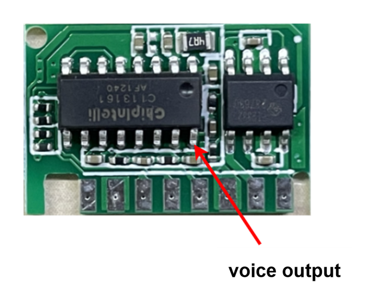 - Use an oscilloscope to measure the voice output test point of the main chip (as shown in the figure below). If no output waveform is detected at this point when there should be voice output, please check if the firmware is correct. If there is an output waveform, check if there is any soldering issue with the power amplifier device on the module or if the power amplifier itself is abnormal. If the problem cannot be identified through the above checks, please contact our technical support for assistance.