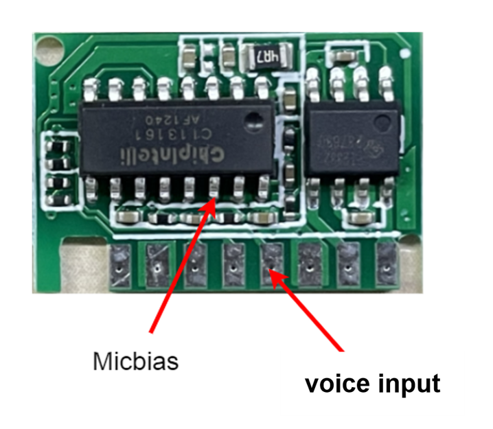 - Use a multimeter to measure if the MICBIAS pin of the main chip is about 2.8V, and use an oscilloscope to check if there is an input voice waveform on the microphone input pin (set the oscilloscope to 100mV per division). If the signal is normal, consider whether the firmware is correct. If the signal is abnormal, check if there is any physical damage to the module hardware. The measurement points are shown in the figure below. If the problem cannot be identified through the above checks, please contact our technical support for assistance.