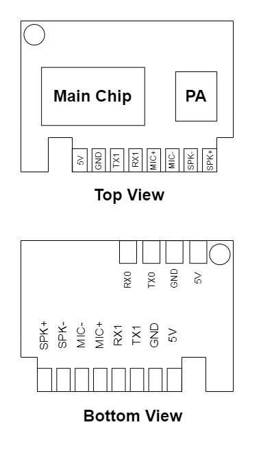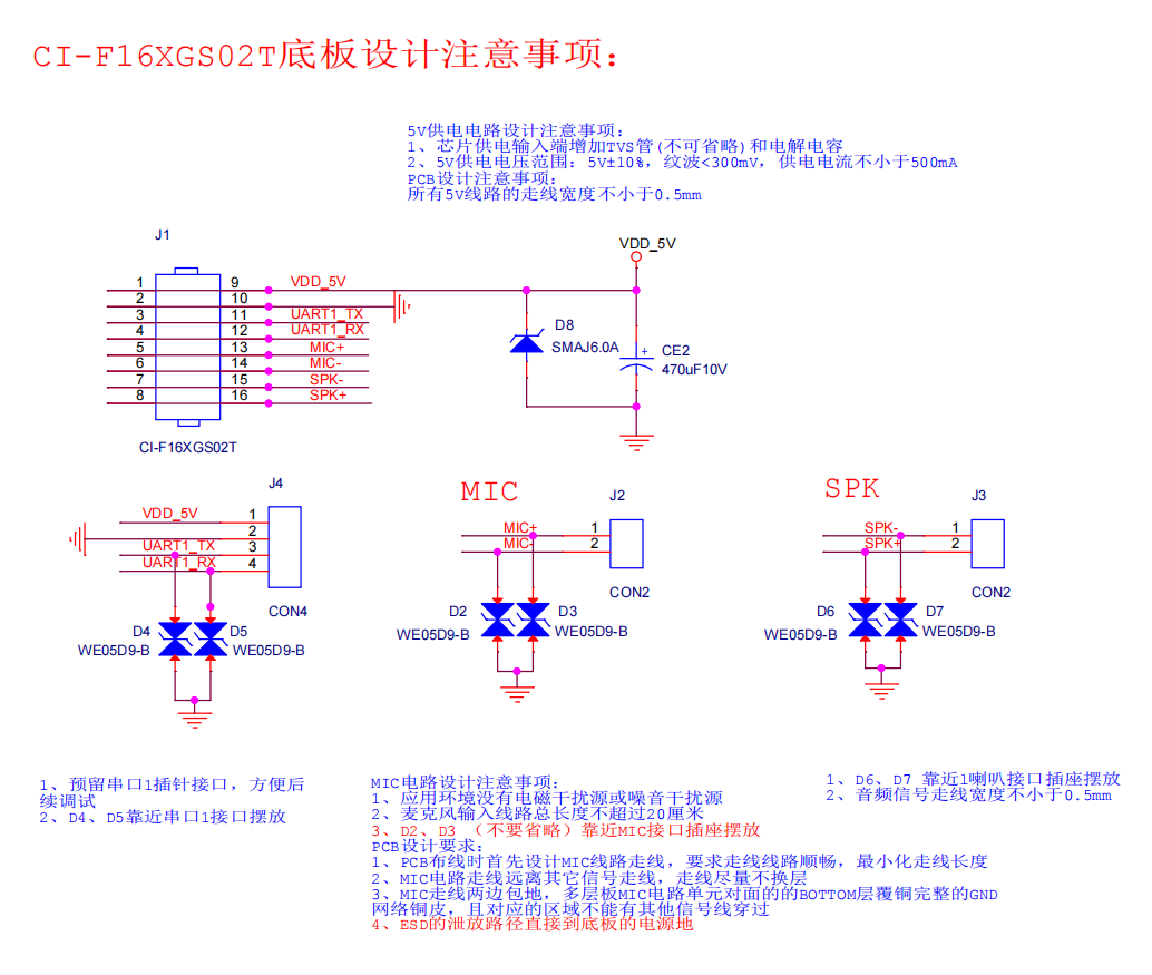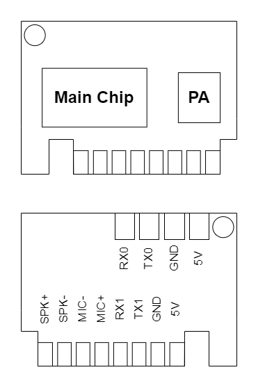 When designing the carrier board or host motherboard, a capacitor with a capacitance of not less than 100uF should be configured at the 5V power input port of the module, and the wiring of the microphone signal should be as short as possible and shielded. The SPK signal wiring should be as short and thick as possible, and there should be no other wiring crossing the wiring area and the back of the area.