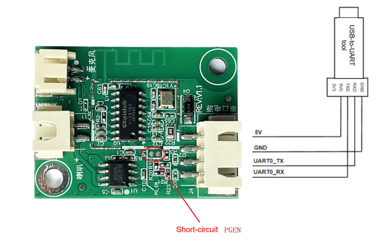 - Voice Firmware Programming: Using the USB-to-UART adapter shown above as an example, connect the power, ground, and UART communication pins to the corresponding pins on the module before programming. Also, short the PGEN pin on the board. Note that the RXD and TXD of the USB-to-UART adapter correspond to UART0_TX and UART0_RX of the module, respectively. The connection method is shown in the figure below.
