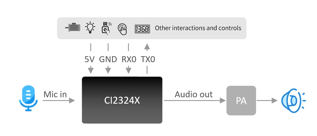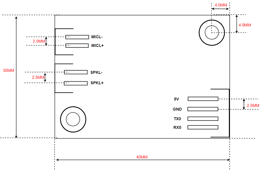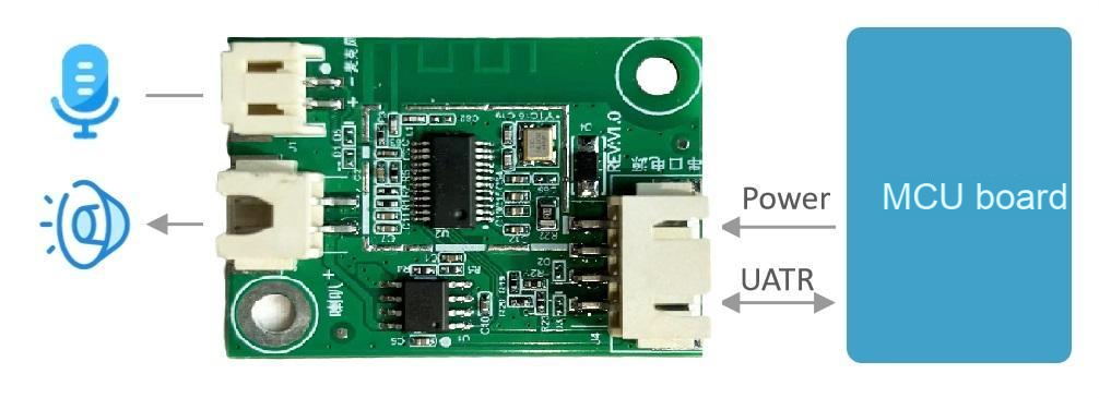 - Equipped with one microphone input, one speaker output, and one 5V power supply with UART interface (5V level)