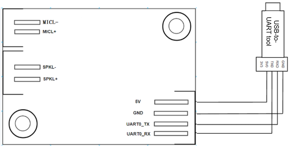 For voice firmware flashing, connect the USB-to-UART converter’s power, ground, and UART pins to the corresponding pins on the module. Note that the USB-to-UART converter’s RXD and TXD should be connected to the module’s UART0_TX and UART0_RX respectively, as shown in the figure below.