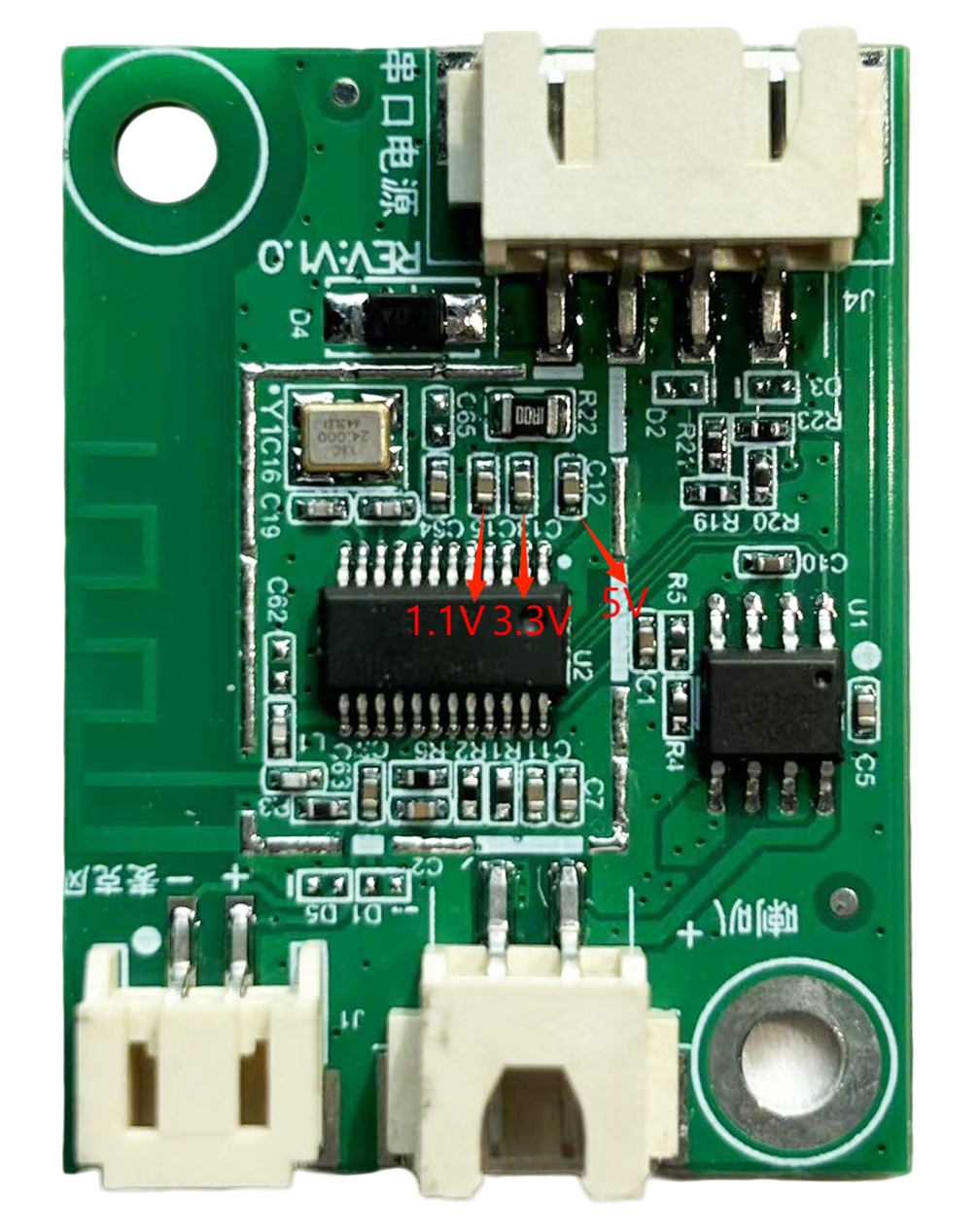 - Module Cannot Be Flashed or Updated If this issue occurs, check the following: 1. Ensure TX, RX, and GND are properly connected, select the correct COM port in the flashing tool (Figure 13), then apply 5V power. 2. Verify the UART pins are correctly connected (TX/RX not swapped), the USB-to-UART driver is properly installed, and the correct COM port is selected in the flashing tool. 3. If the issue persists, use a multimeter to check the module’s power supply voltages (5V, 3.3V, 1.1V) at the test points shown below. If any voltage is incorrect, the module may be faulty and should be replaced or repaired. If all checks are normal, contact technical support for assistance.