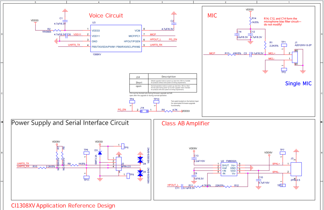 The reference design circuit diagram shows a typical application solution for CI13082V with single-ended microphone input and power amplifier output. This design is not limited to any specific end product. The application design should be based on the principle of adapting to the host terminal product. According to the functional and performance requirements of the end product, please visit ChipIntelli’s documentation center and AI platform to download reference schematics and PCB layouts. Documentation Center: https://document.chipintelli.com/.