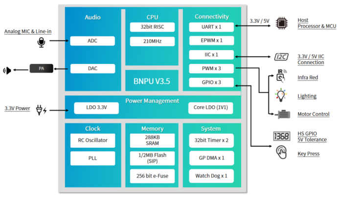 - Utilizes ChipIntelli’s next-generation hardware BNPU technology, supporting DNN/TDNN/RNN/CNN neural networks and parallel vector operations, enabling high-performance voice recognition, noise reduction, and other functions