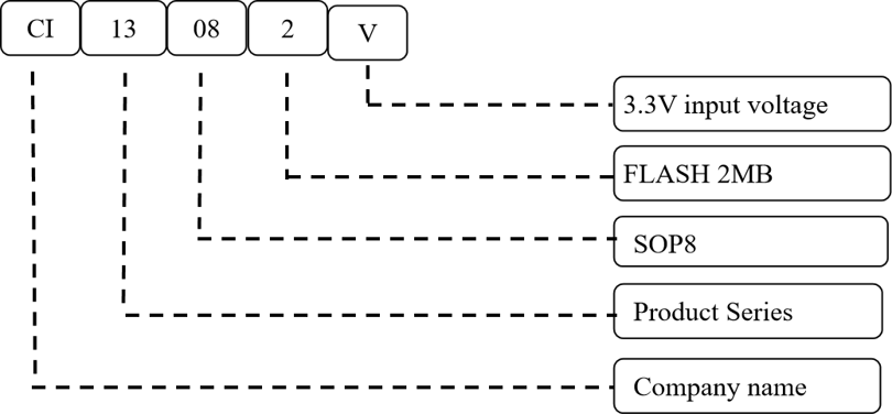 The CI13082V chip package marking is shown in the figure below. Line 1: Company logo Line 2: Chip model Line 3: Production lot number The dot in the bottom-left corner marks pin 1.