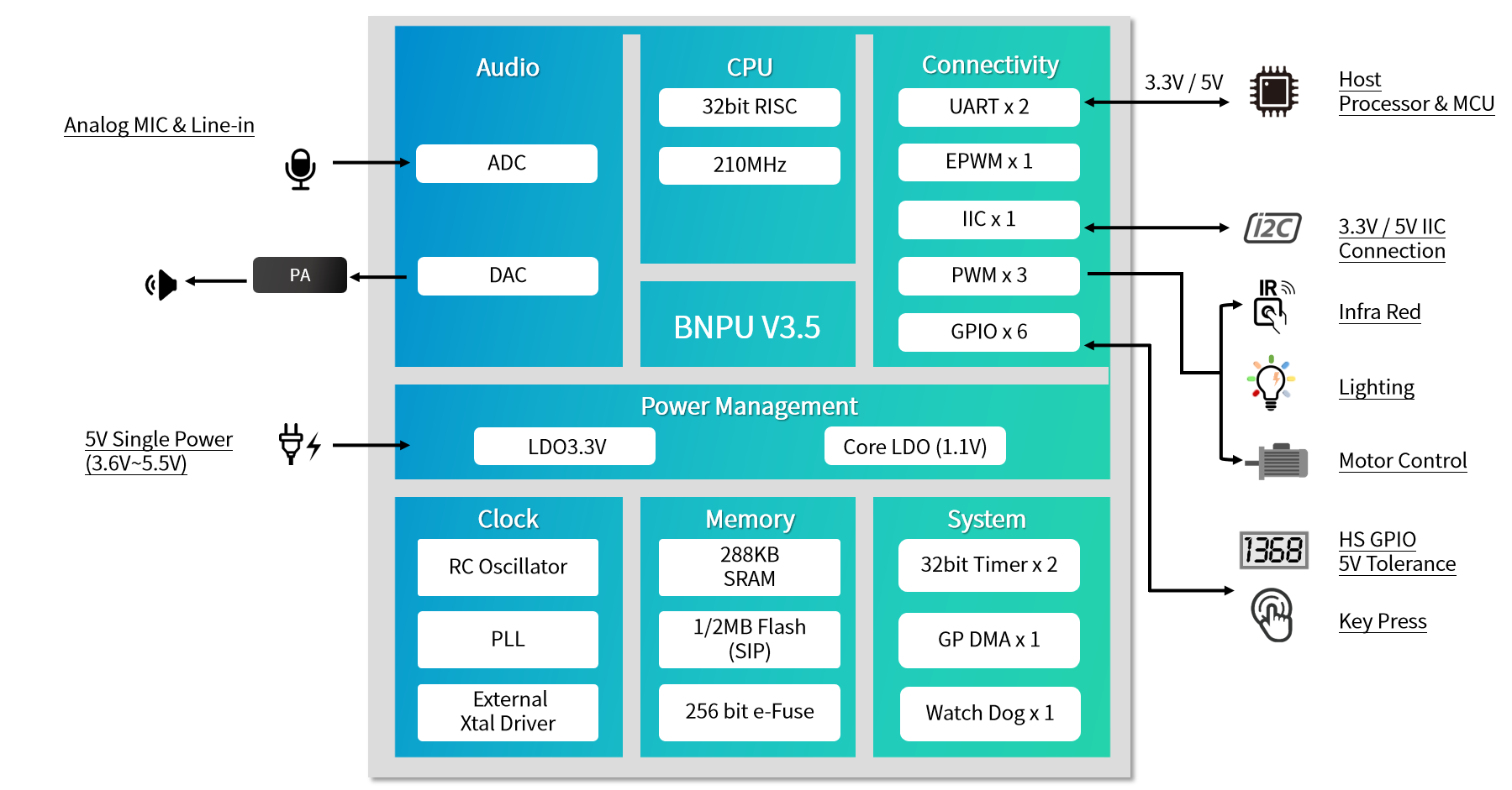 - Utilizes Chipintelli’s new generation BNPU hardware technology, supporting DNN/TDNN/RNN/CNN neural networks and parallel vector operations, enabling high-performance speech recognition and noise reduction.