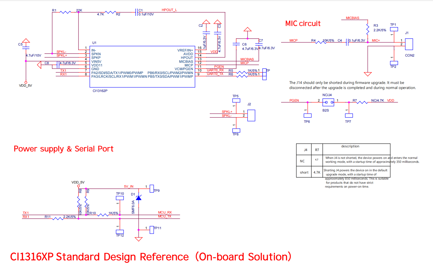 The above diagram shows the reference design circuit for a typical application of the CI1316XP series chips, including CI13162P, featuring single-ended microphone input and power amplifier output. This design is not limited to any specific product. The application design should be based on the principle of adapting to the host terminal product. According to the functional and performance requirements of the end product, please visit the Chipintelli Documentation Center and AI Platform to download reference schematics and PCB layouts. Documentation Center link: https://document.Chipintelli.com/.