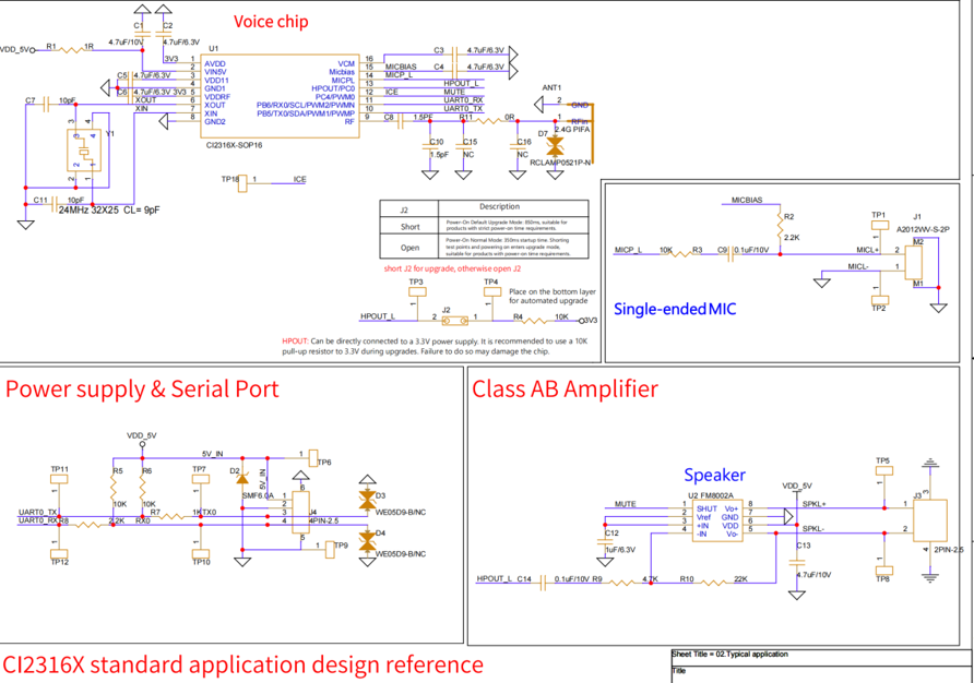 The above diagram shows the reference design circuit for the CI2316X series chips (including CI23162), featuring single-ended microphone input and power amplifier output. This design is not limited to any specific end product. Application designs should be based on the principle of adapting to the host terminal product. For reference schematics and PCB layouts, please visit Chipintelli’s Documentation Center and AI Platform: https://document.Chipintelli.com/.