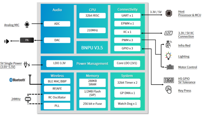 - Utilizes Chipintelli’s next-generation BNPU technology, supporting DNN/TDNN/RNN/CNN neural networks and parallel vector operations for high-performance voice recognition and noise reduction
