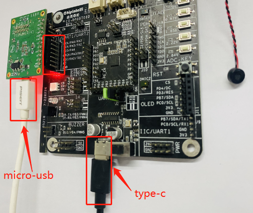 ① Connect the sound capture board to the development board. For the CI-D06GT01D development board, you can directly insert the corresponding pins of the sound capture board into the female headers. Finally, connect both the development board and sound capture board to the computer using Type-C and micro-USB cables respectively.
