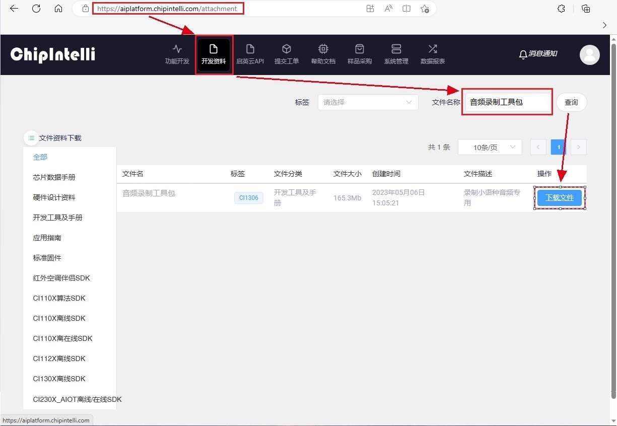 In the Chipintelli AI Platform’s development materials, search for “Audio Recording and Processing Toolkit” in the file name, then download the corresponding toolkit to your computer.