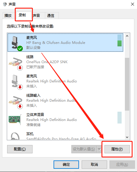 ③ Click on “Recording”, then right-click on the microphone corresponding to the sound capture board and select “Properties” (set the recording microphone as the default device).