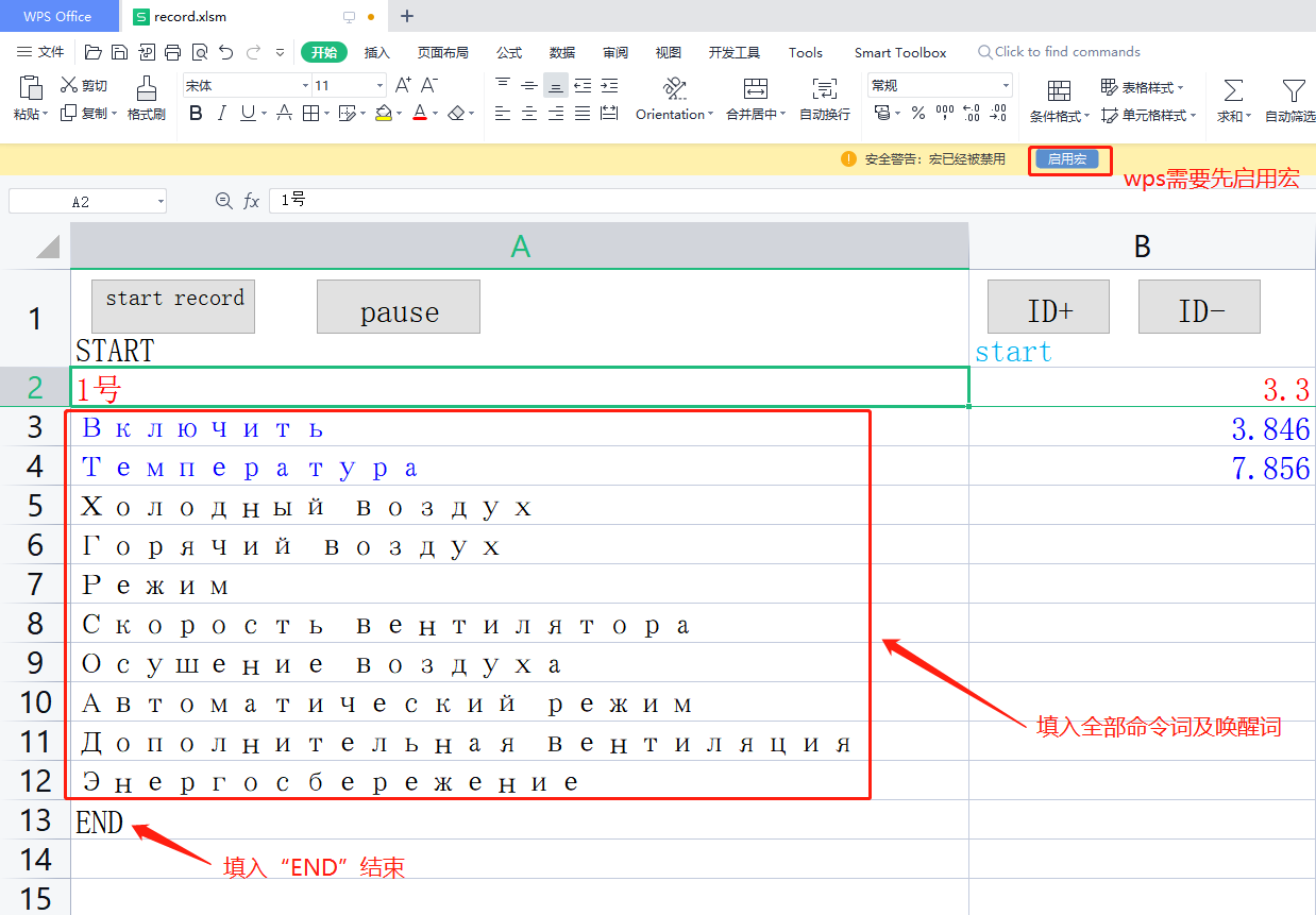 ② Enter the previously proposed wake words and command words in the first column of the Excel sheet, followed by “ENG” to mark the end.