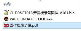 Open the “5. Development Board Recording Firmware” folder and follow the steps in the “固件烧录步骤.pdf” document (sections 3 and 4) to program the “CI-D06GT01D开发板录音固件_V101.bin” firmware using the “PACK_UPDATE_TOOL.exe” tool.