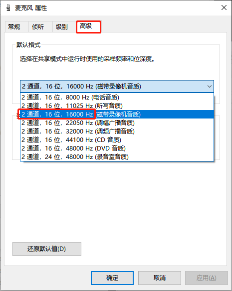 ④ In the microphone properties, click on “Advanced” and select “2 channel, 16-bit, 16000Hz…” from the default format dropdown, then click “OK” to complete the configuration.