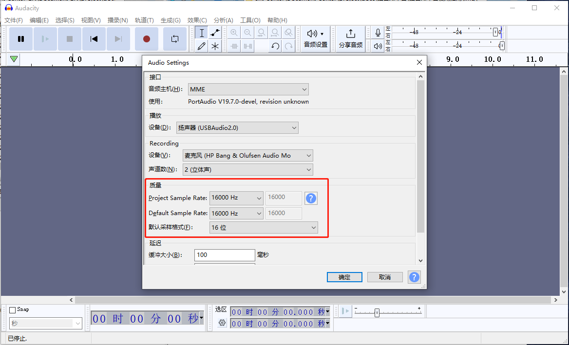 ② Set the default sample format (16-bit) and sample rate (16000Hz), then click “OK”: