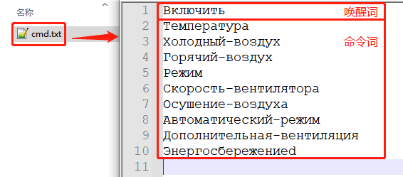 To develop a Non-Chinese language voice product, first create a text file named cmd.txt on your computer. Fill it with the proposed wake words and command words (replace any spaces with hyphens), then save it for later use. The following example uses Russian: