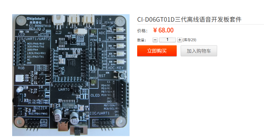 We recommend using the CI-D06GT01D V3 offline voice development board equipped with Chipintelli’s V3 intelligent voice recognition chip. You can purchase samples on our official website.