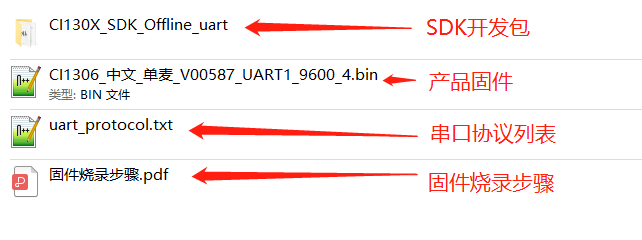 - The file after decompression contains an SDK software development kit, product firmware, a UART protocol list and a firmware flashing step manual;