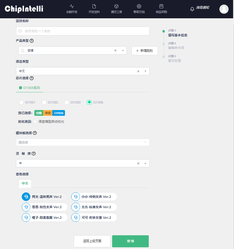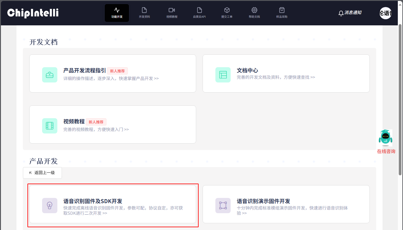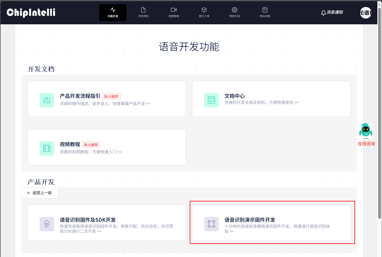 For experienced AI voice developers, go to ☞User Guide for Chipintelli AI Speech Development Platform. The platform provides comprehensive information and resources for product development. The platform is free to use. After registration, you can start your product development journey.