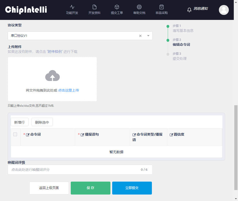 Method 1: The platform will recommend command word templates for downloading and editing according to the product type. After editing, click “Click here to upload” on the web page to display command words and other information in the data area. The specific operation steps are as follows: