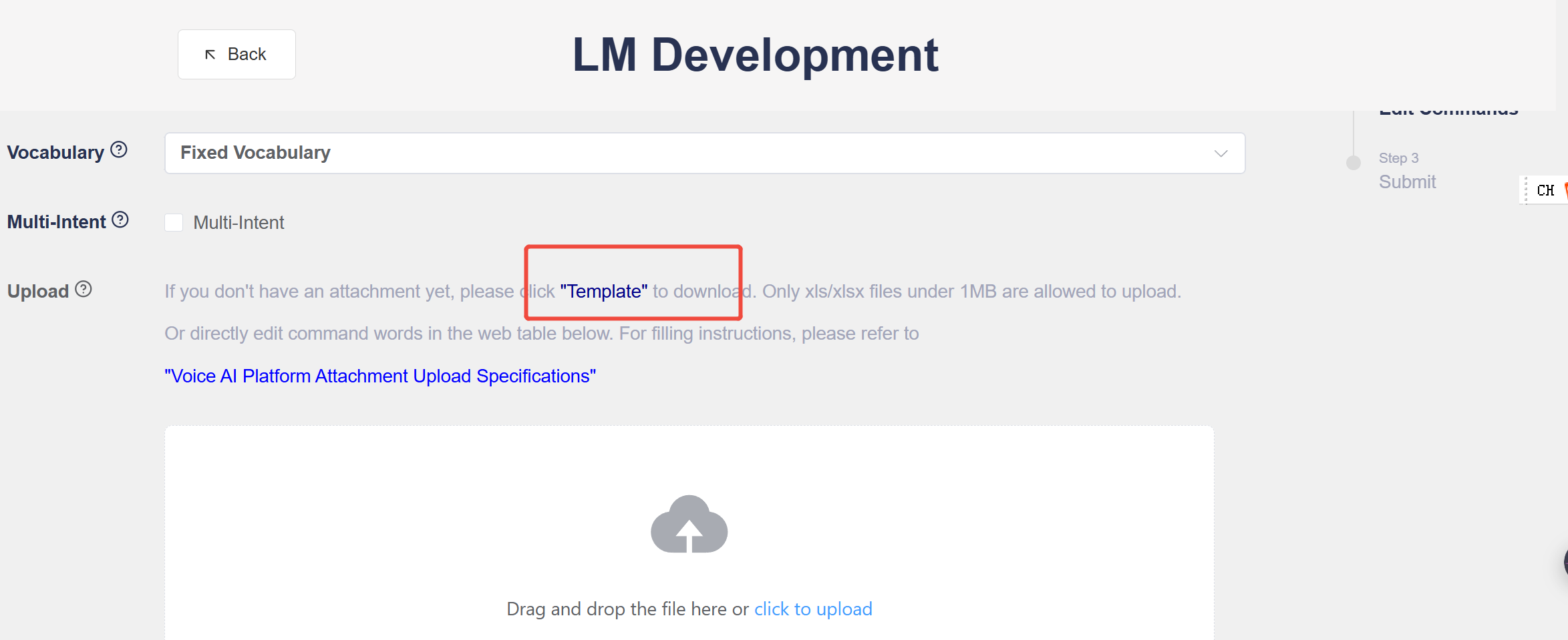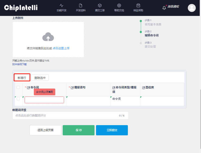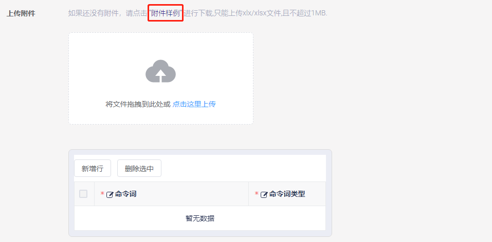 - For the attachment, you’ll need to upload an Excel list of command words. First, click “Attachment Example” to download the Chinese template for the command word Excel list.