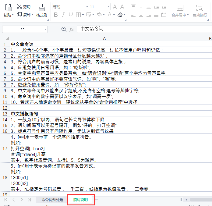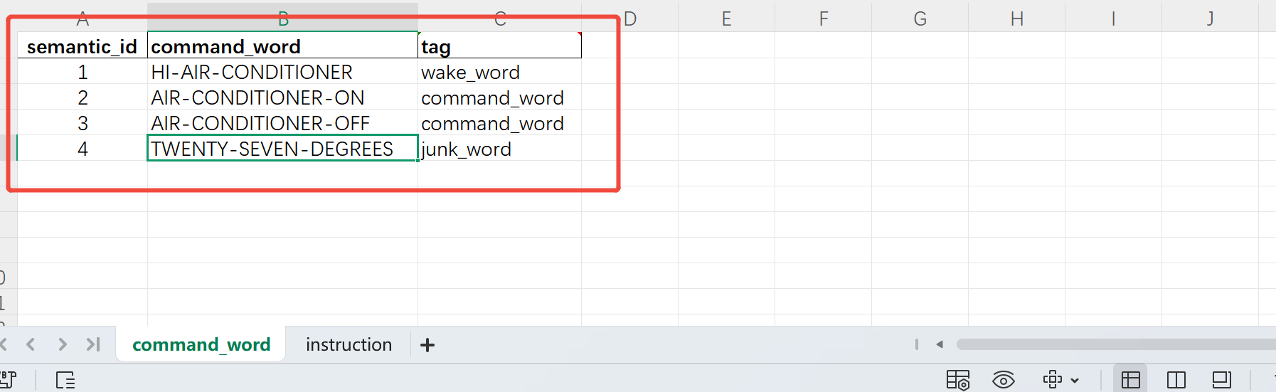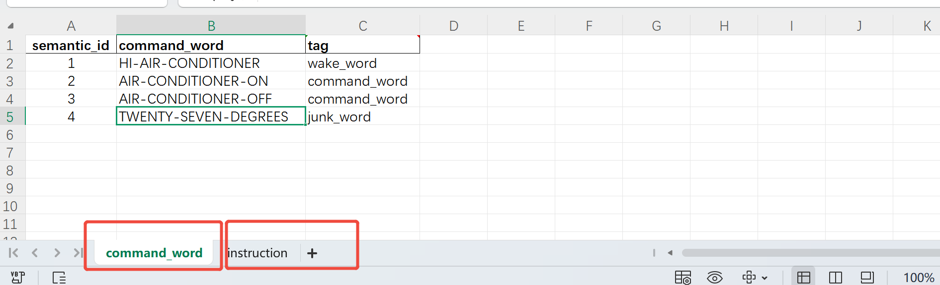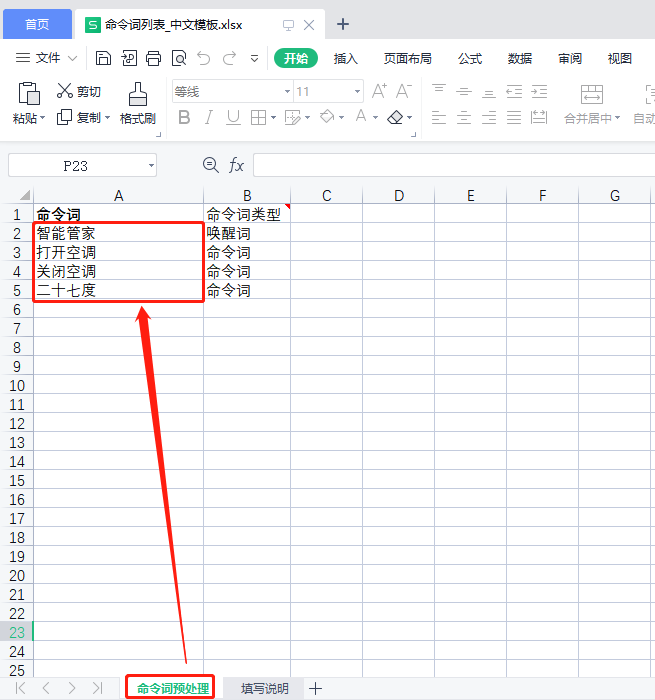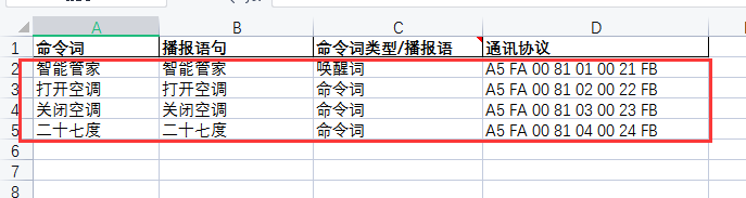 - Open the downloaded Excel template and enter all command words and wake words into the table, then save the file.