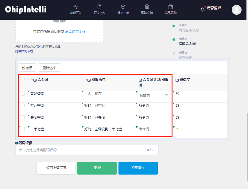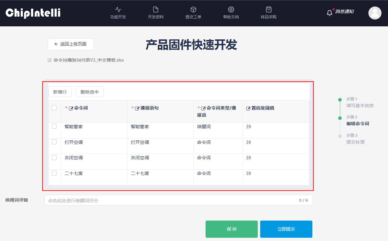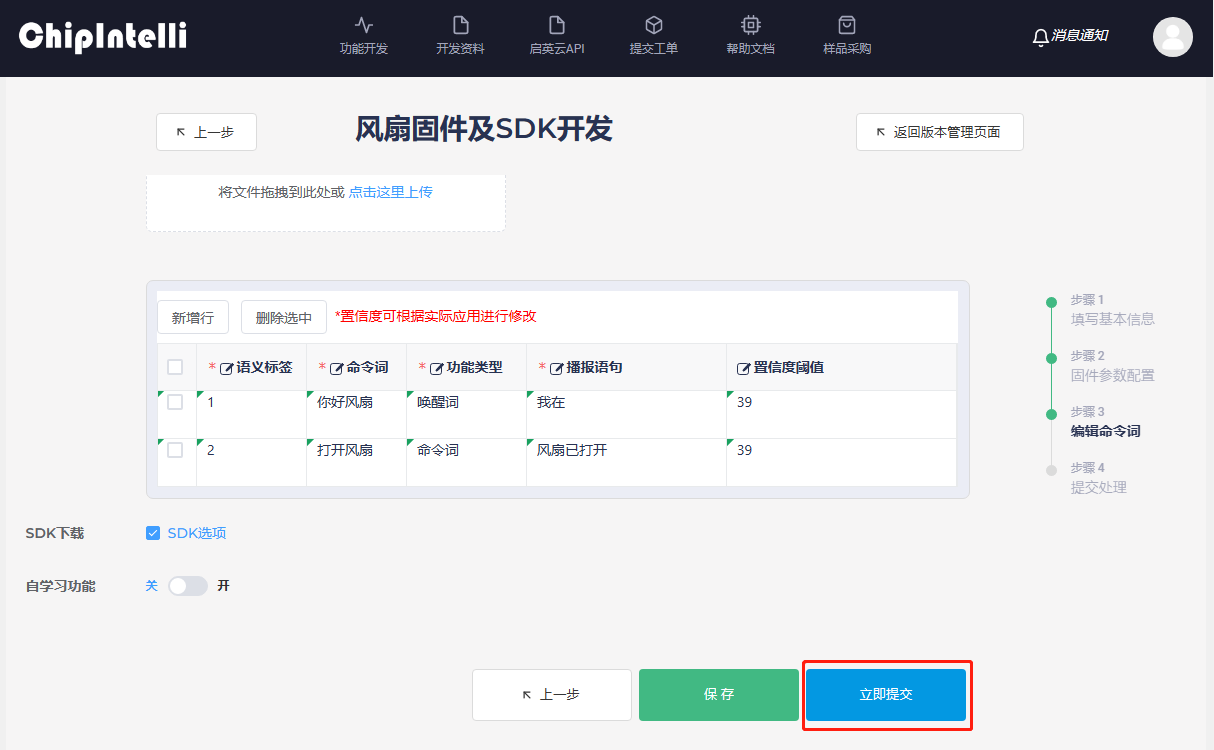 - Next is the “Edit Command Words” page. [Timbre Selection] is to select the timbre of the broadcast sound fed back after recognition. It is recommended to use the timbre with Ver.2. [Speech Speed] and [Volume] can be adjusted, and [Broadcast Sound Audition] can also be performed. [Broadcast Configuration] also needs to be filled in according to the instructions on the page; [Upload attachment] is the Excel form file of the command words, broadcast words or agreements filled in by the user. It is necessary to download the attachment sample and fill it in. If it is filled in correctly, it will be uploaded to this page. The page form will be displayed in real time and support page fine-tuning. [SDK download] is a check option. After checking, the SDK development package of the corresponding firmware will be obtained; [Self-learning function] is off by default, which can be viewed in ☞Video.