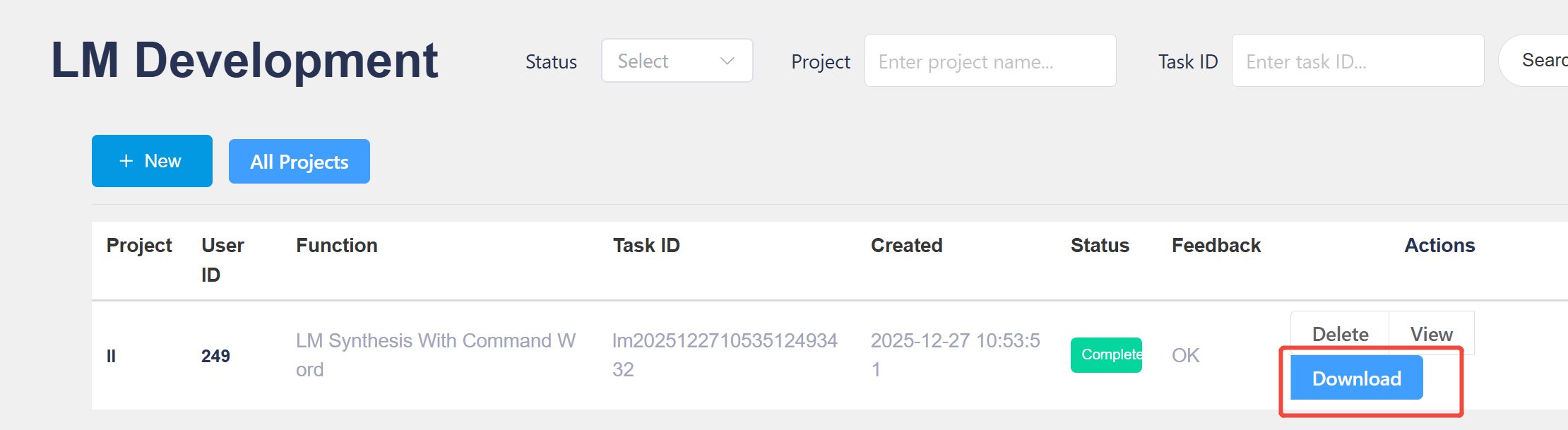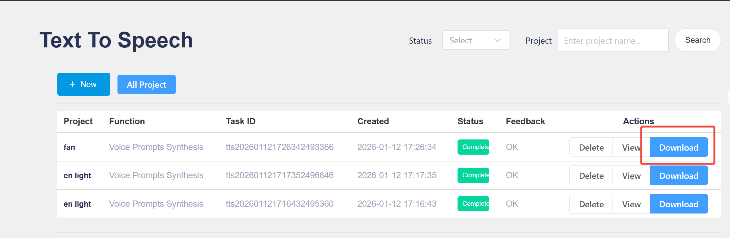 After successful submission, the page will automatically jump to the project page, and you can see that the current status of voice prompt synthesis is “In Progress”;
