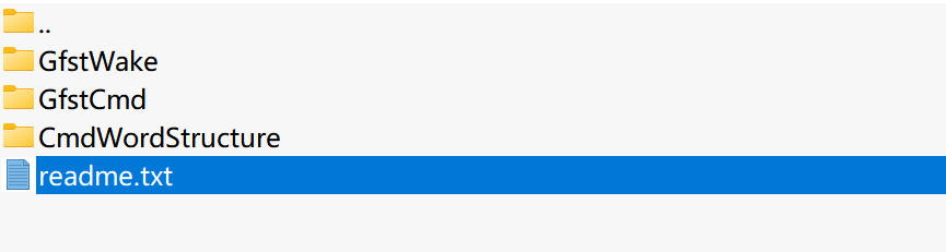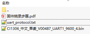 The extracted file contains “XXX. bin” product firmware, UART protocol list and Firmware flashing Steps document, as shown in the following figure. Please open the Firmware flashing Steps document; flash the firmware to the development board according to its steps to experience and test the speech recognition effect.