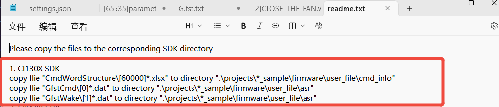 readme.txtfile; Copy the contents of each file to the corresponding path of the SDK according to the steps in the “readme.txt”.
