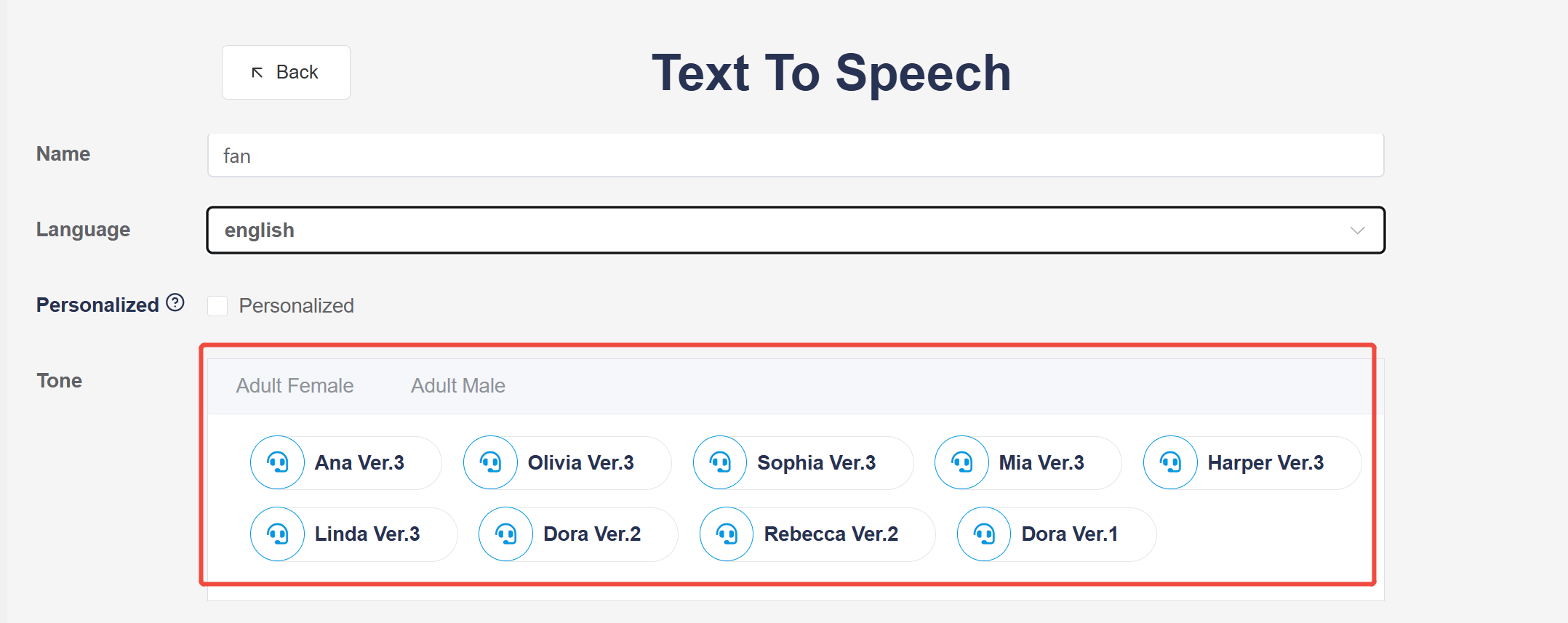 toneunder the corresponding language. There are many tones for selection, such as adult female(multiple) and adult male(multiple).