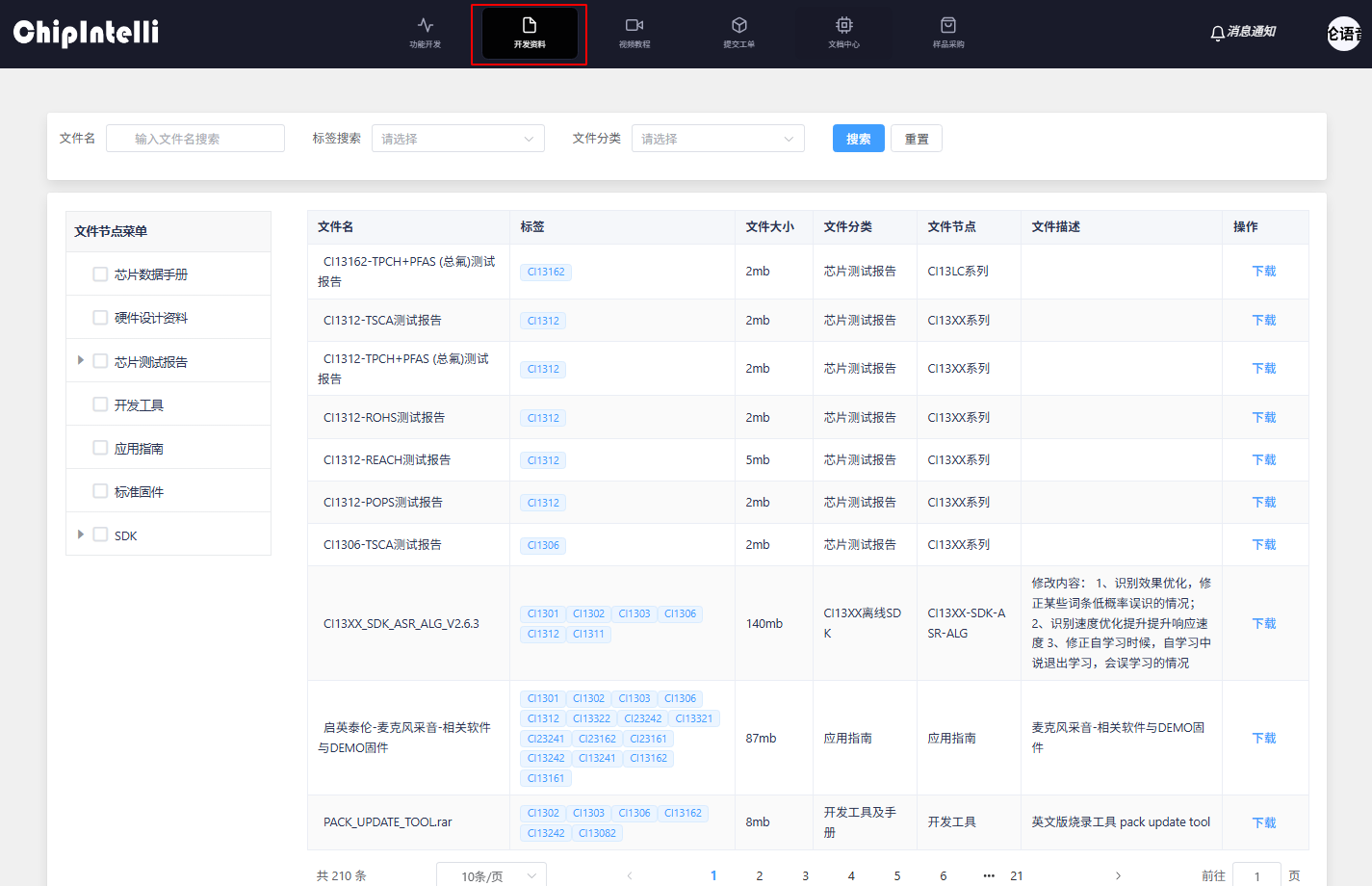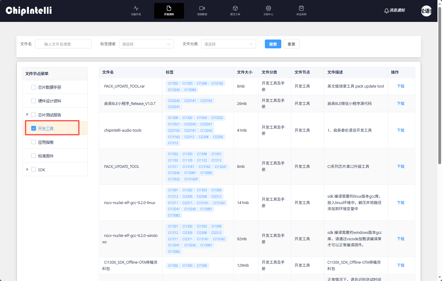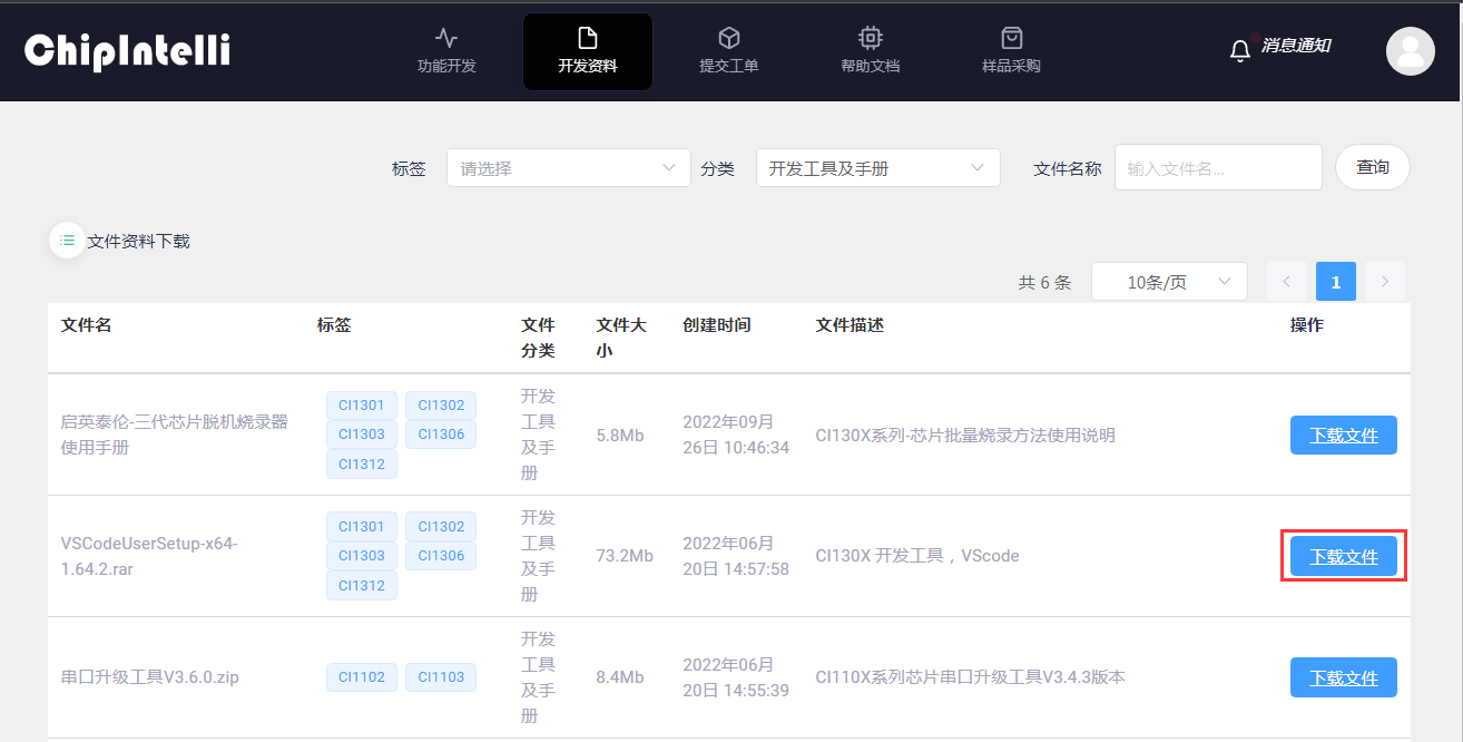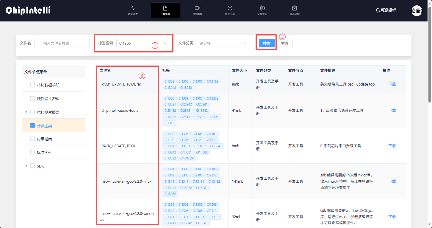 - The user finds the development tool and manual corresponding to the chip model in his hand and clicks “Download File” (here, take downloading the development tool corresponding to the CI130X chip as an example);