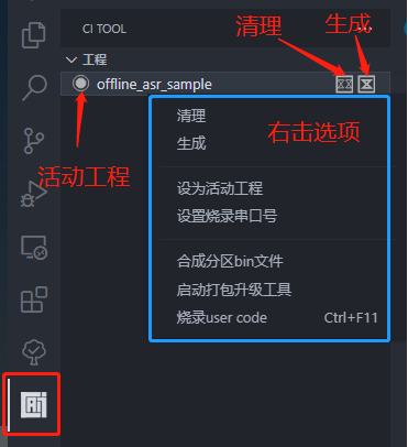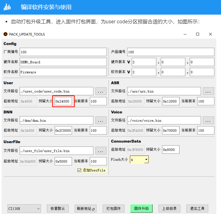 After the user completes Chapter 1 “Development Environment Preparation” and Chapter 2 “Online Product Firmware Development”, this chapter will take you to develop firmware components. The firmware corresponding to our chip is mainly composed of four components: “language model, acoustic model, voice prompts and user code”; Next, we will make each component step by step to synthesize the firmware we want.