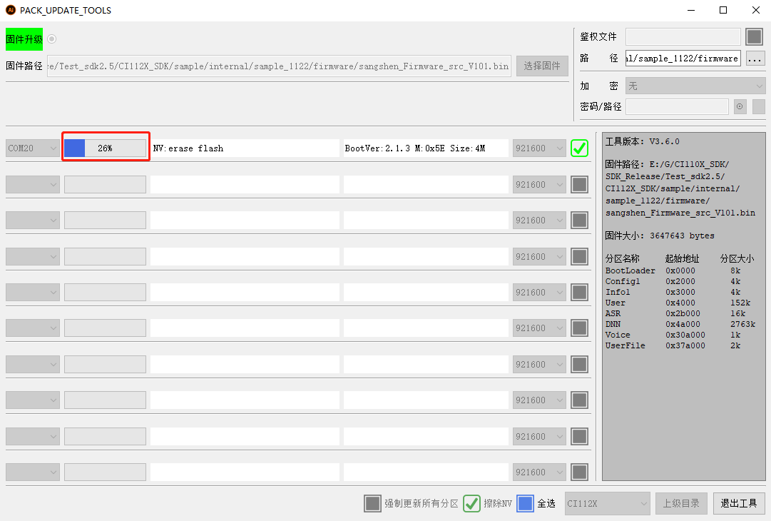 Updatebutton, jump to the update interface, and you will see the serial port number, update progress, update rate, etc., In addition, please note that USB to serial port tool is used to communicate with the computer during firmware pack and update. Please install the USB to serial port tool driver in advance to ensure success development; -