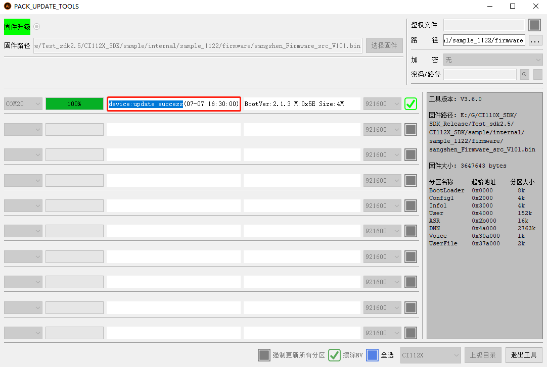 - The Firmware Update tool displays “device: update success....”, which indicates that the firmware download and update are successful; Remove the check and power on again to start the experience test.