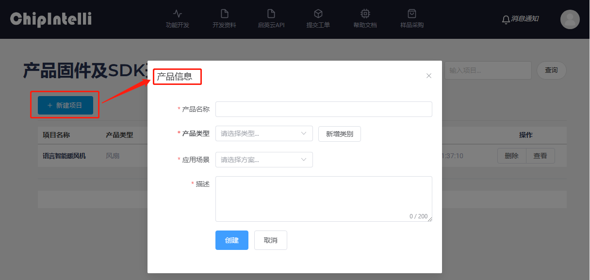 - Click [+ New Project] to fill in the “Product Information”. When the developer fills in and selects the product name, type and description to be developed, the [Application Scenario] selection needs to select the “Single Microphone Offline Serial Port Transparent Transmission Solution_SDK_X.X.X” “, and then click” Create “.
