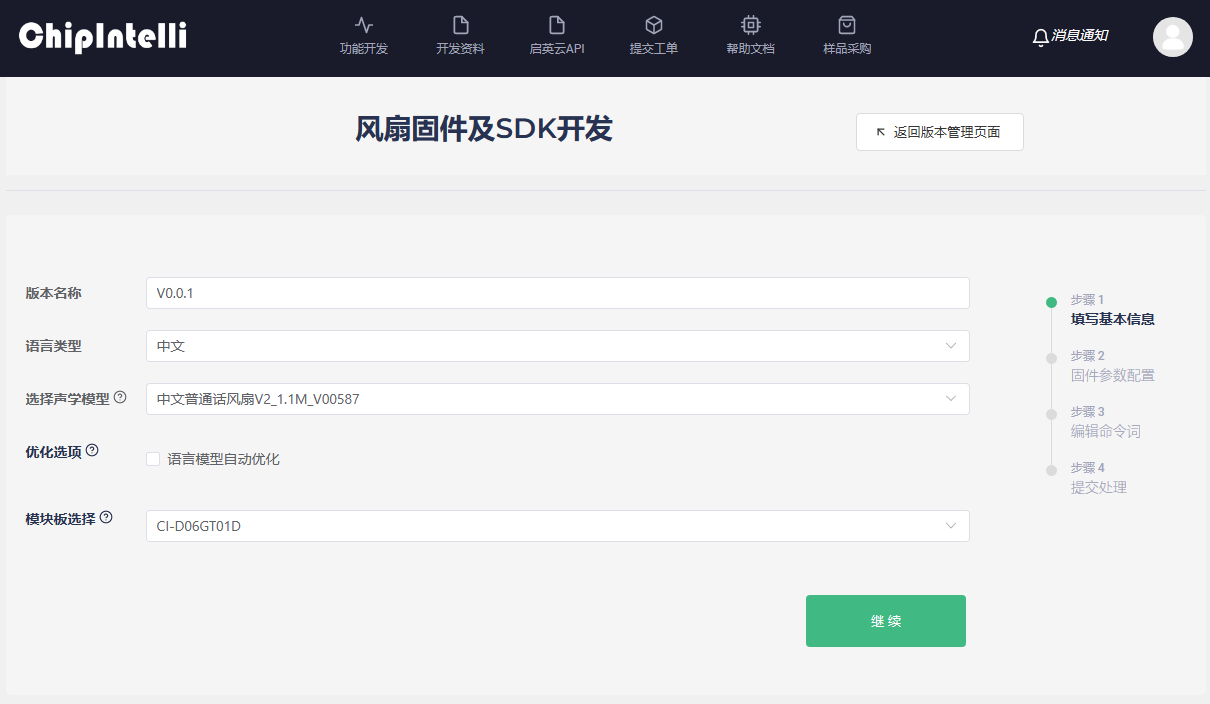- Then create the version of the project, first create the first version, [version information] recommended to fill in “V0.0.1”; [language type] here we select “Chinese”; [Acoustic model] The product type can be entered here to select the latest version of “Chinese Mandarin Fan V2 _1.1M _V00587” (if there is no acoustic model of this product type, the acoustic model with general version can be selected); [Optimization option] is not a required option. The experience effect of the first firmware production can not be selected. If this function is selected, the system will automatically optimize the wake-up words and command words. The recognition experience effect after optimization is better, but the optimization time is relatively long. According to the current busy level of the system, the optimization time generally ranges from 20 to 120 minutes. Please wait patiently for the optimization to be completed; [Module board selection] Select the module board model used for development in the user’s hand; click “Continue” after completion.