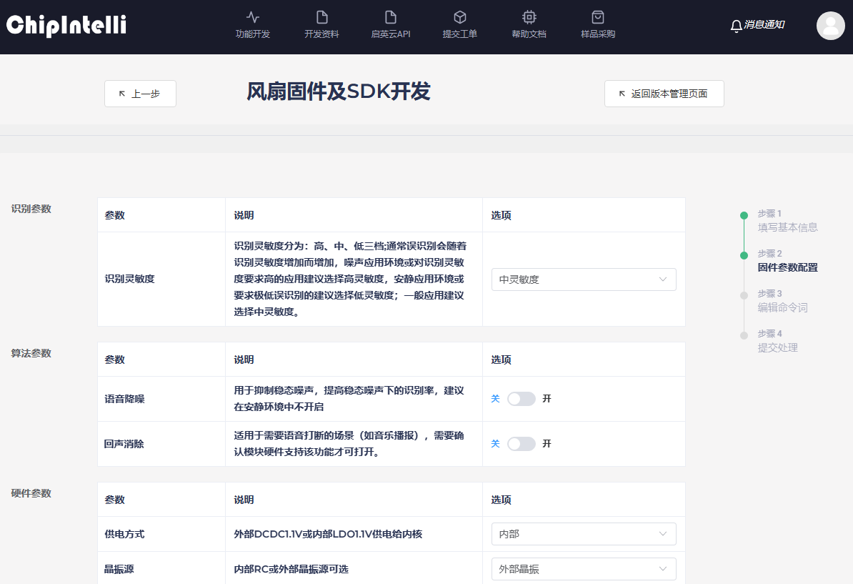 - Enter the “Firmware Parameter Configuration” page, and select and fill in the contents of this page according to the actual situation of the project, including [Speech Recognition Parameter], [Algorithm Parameter], [Hardware Parameter], “Function Parameter”, [Print Serial Port Configuration], [Communication Serial Port Configuration] and [Power Amplifier Configuration]. Each parameter on this page is described in detail. After filling, click “Continue”.