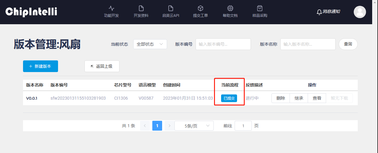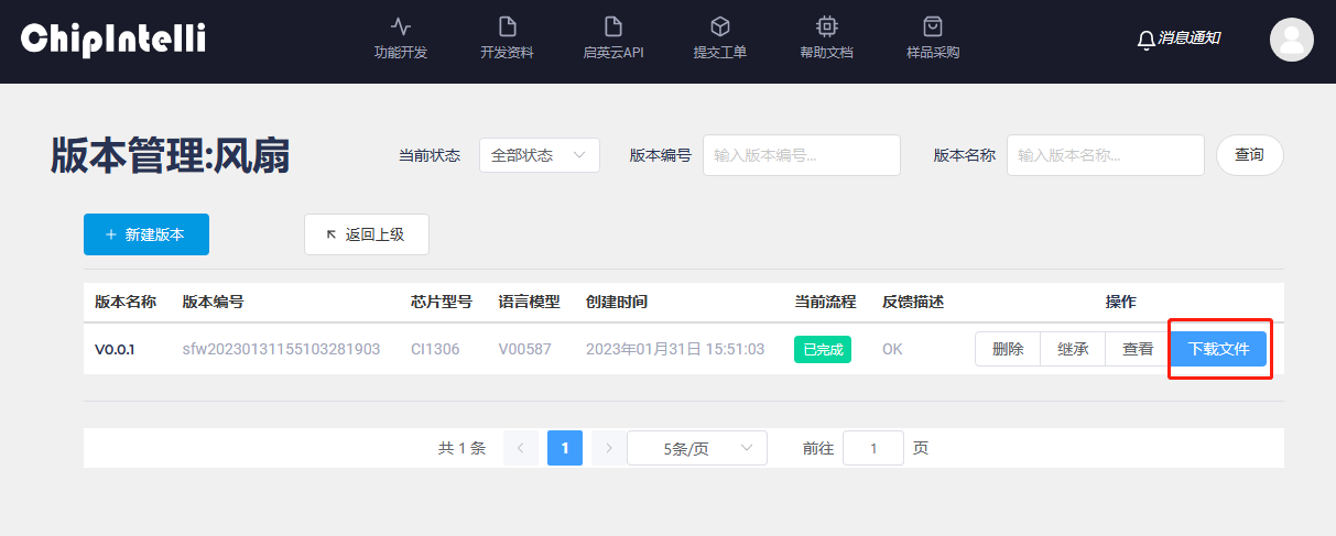 - Next, let’s take electronic fan “single microphone offline firmware with customized protocol” as an example, and enter the “development” page of the AI Platform.